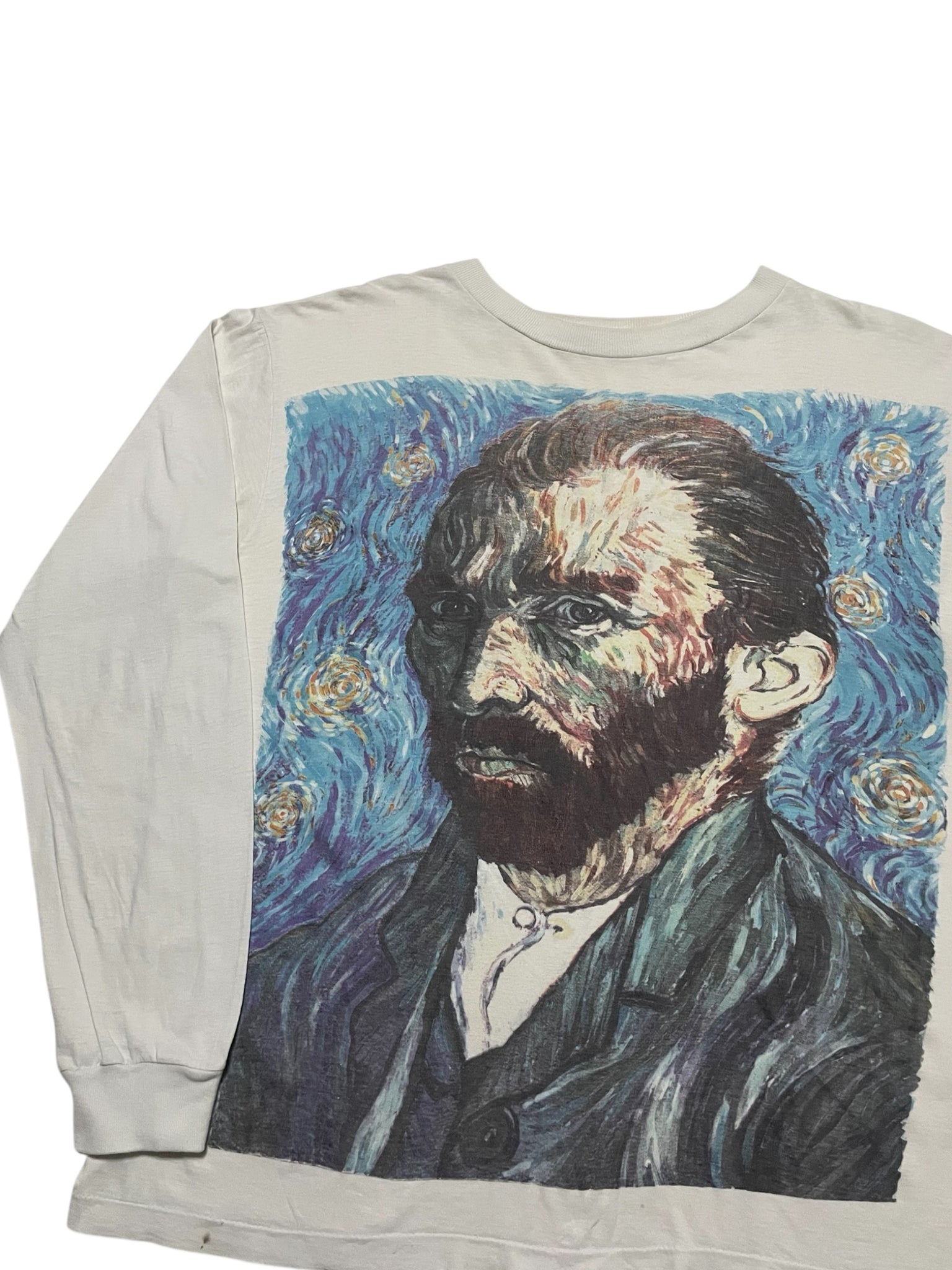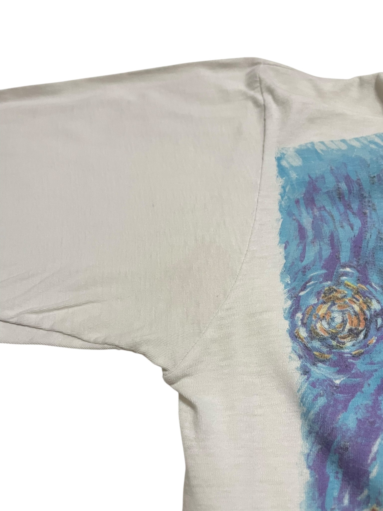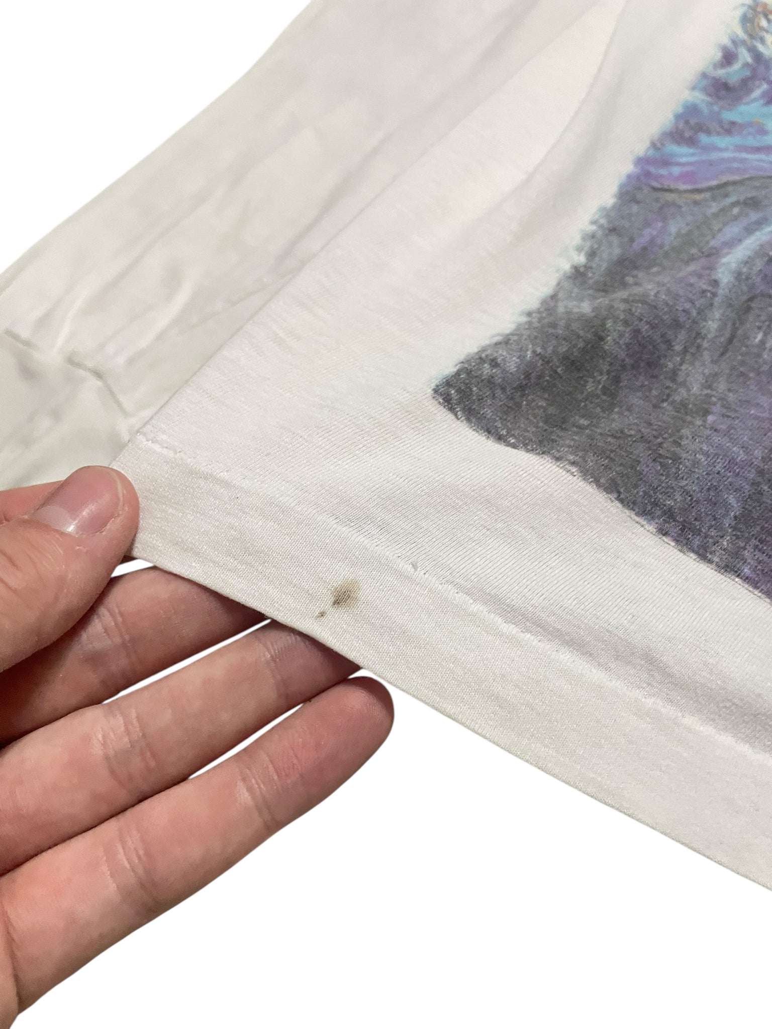 Has some light discoloration, one small hole/mark towards the bottom of the shirt.