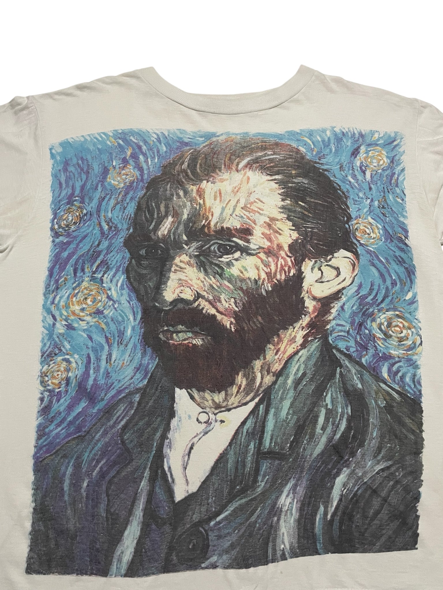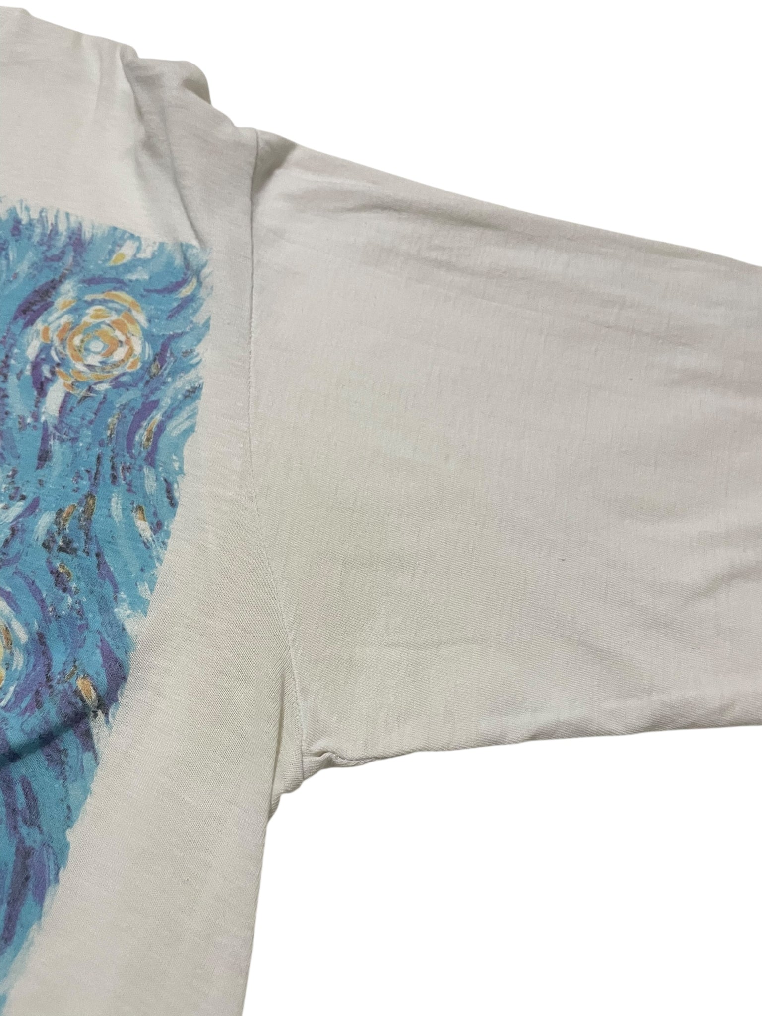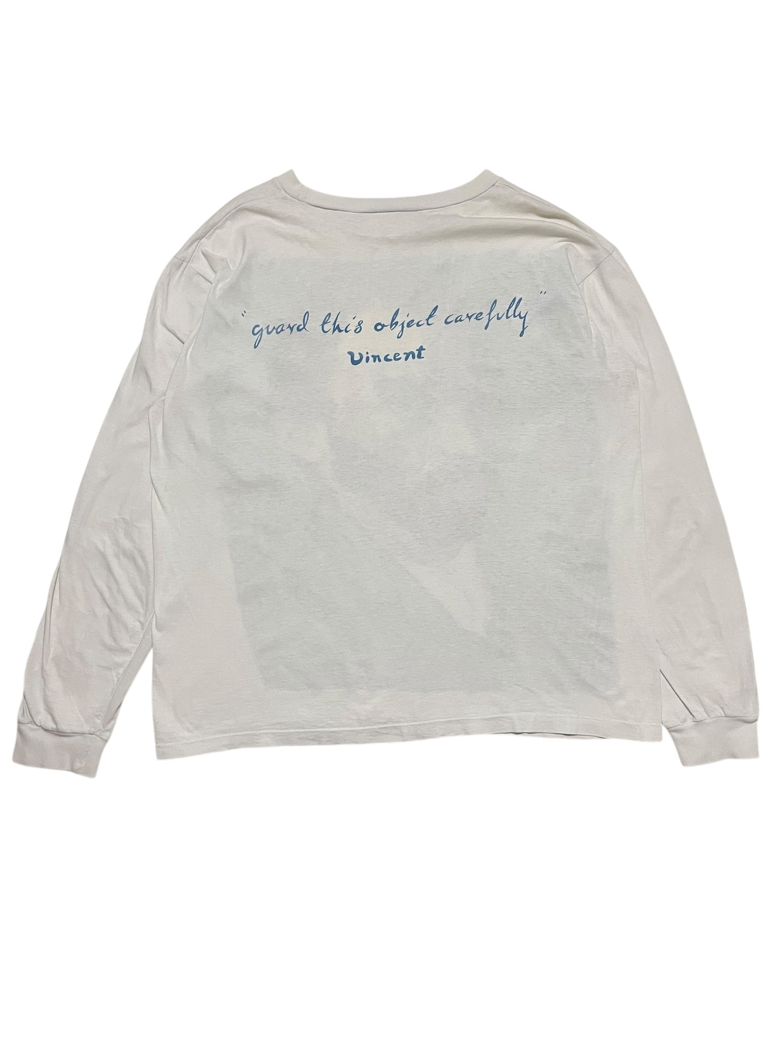 Has some light discoloration, one small hole/mark towards the bottom of the shirt.
